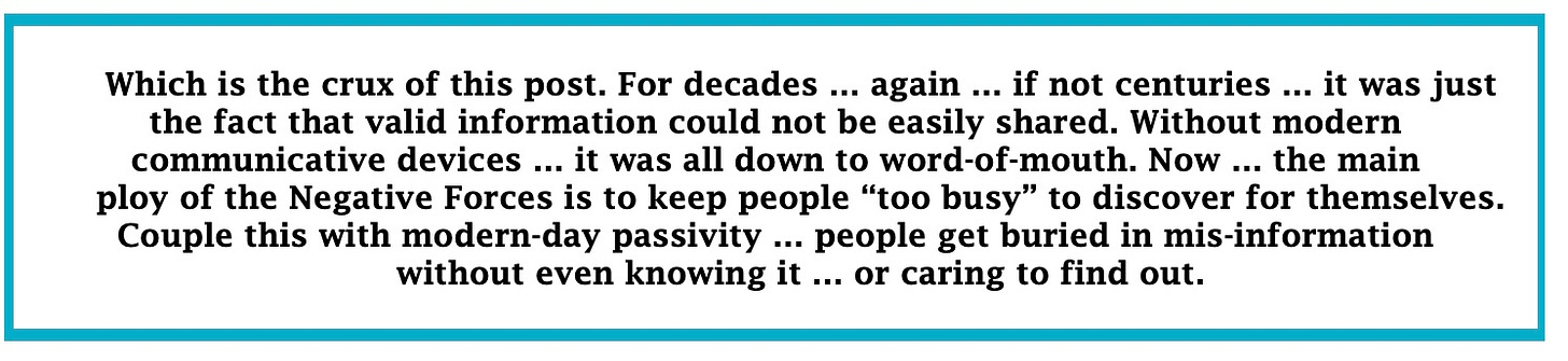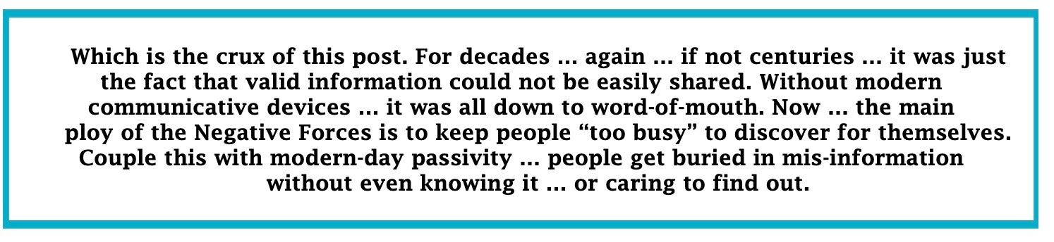 Our world is being … and has been … swamped with mis-truths … or at best … half-truths. The reality of UFO’s and aliens is just one minor long-term example. They have been in our skies for decades … centuries even … yet many want the executive authorities to come out and clearly state it is so before they will allow themselves to believe it … when the evidence is right before your eyes … for those that wish to uncover the evidence on their own.