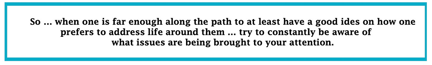 No … I am *not* suggesting that we all amble through life in apprehension and dread. Just … be aware … constantly. There are few other ways that LIFE can nudge you to face yourself other than to bring issues and situations into your life where you will do just that. If you keep overlooking them … they will all continue … and more often than not … get worse.