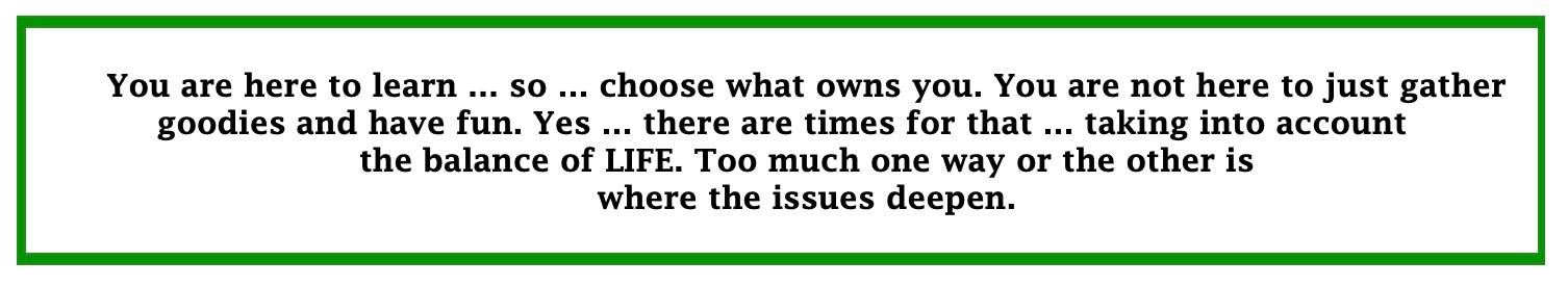 Head into the issues of beliefs as being *your* choices out of the whole. Out of any issue … there are 360 options … the degrees in a circle. YoU … chose the one you are living now. You probably did not know the effects … the far-reaching ramifications it would lead to … and you are finding that out now.