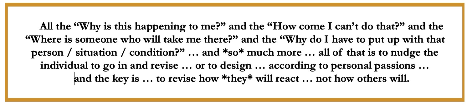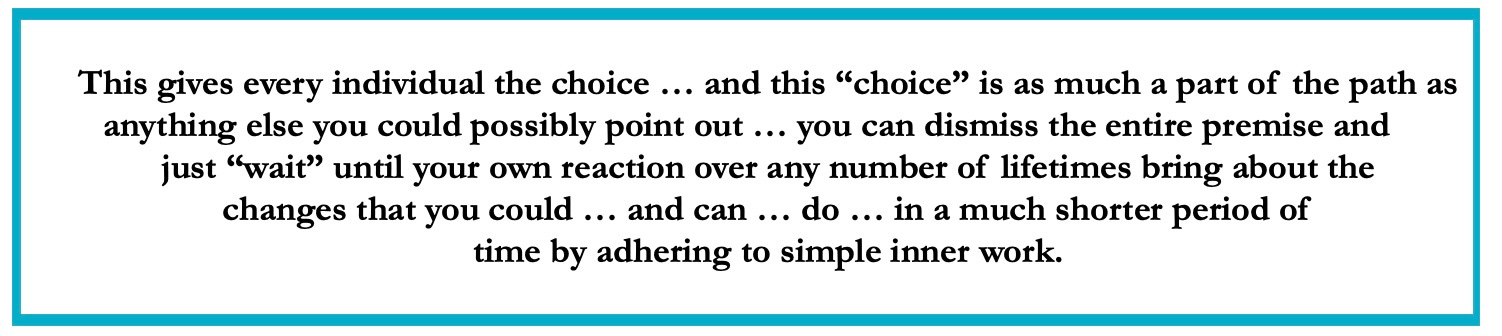 In the short-run … and by that I mean in the current lifetime … you will not get anywhere … be anything … do anything … beyond your current state of consciousness … unless and until you go in and design your way “into” it and BE it first … via a very generic term I have been using … and that is … inner work.